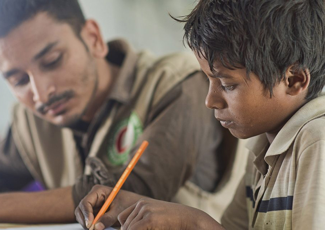 Rasid Ahamed’s brows are furrowed in concentration as he finishes his drawing in a child-friendly space ...