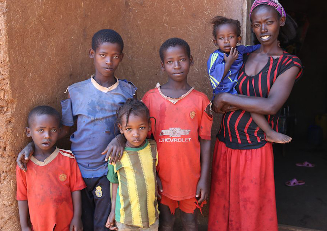 Holding her youngest daughter with one hand and carrying a 20 litre jerry can full of water with the Abebech...